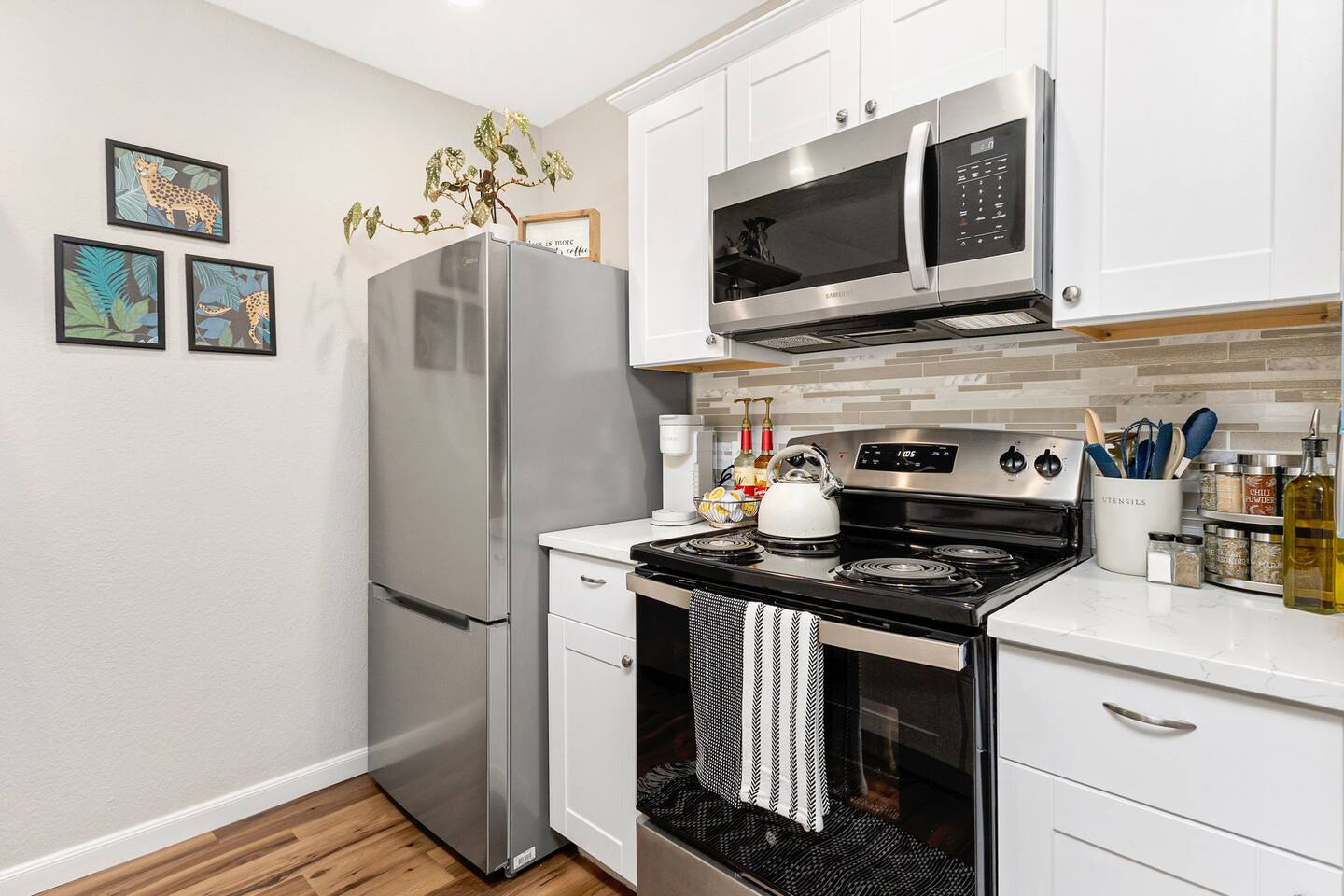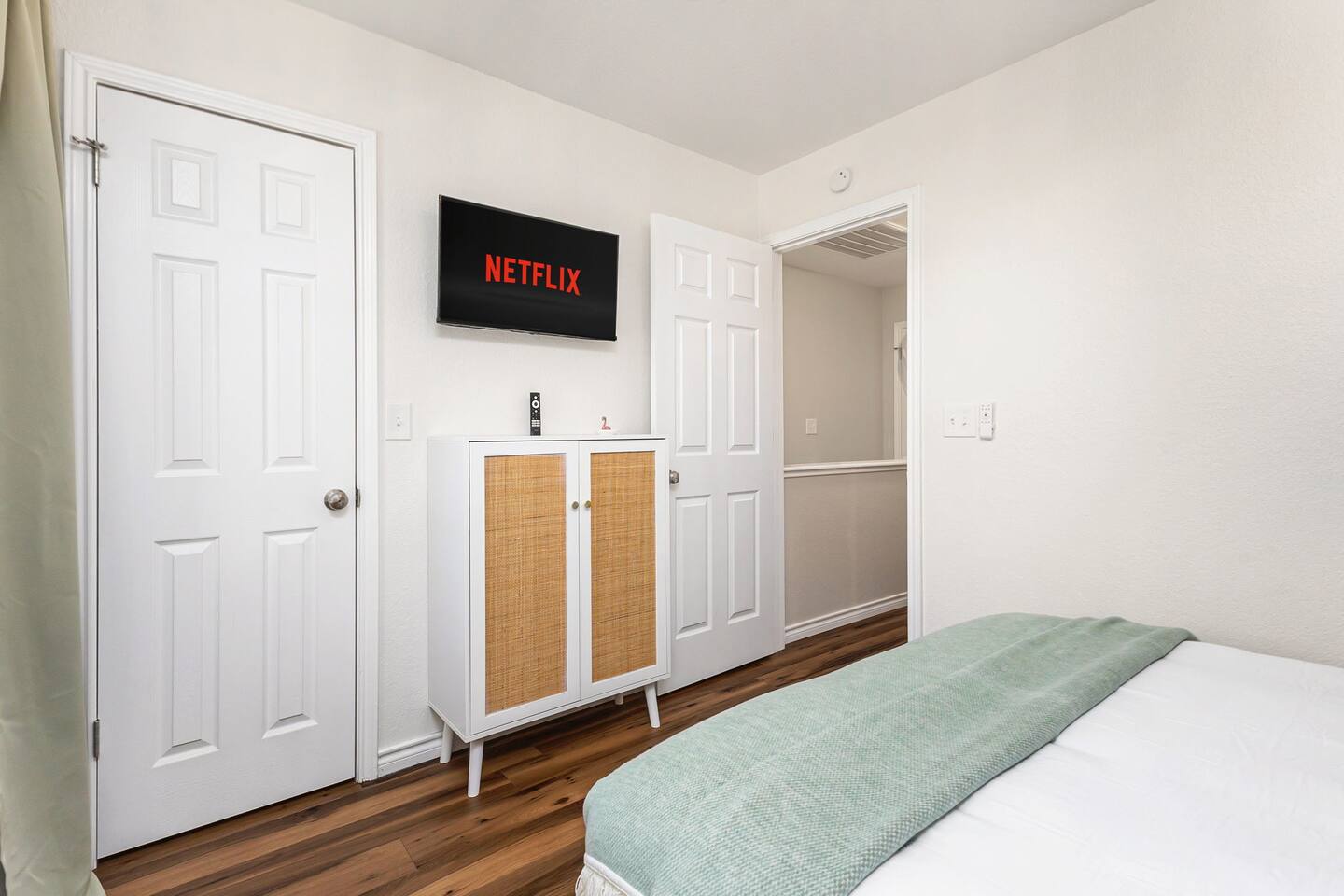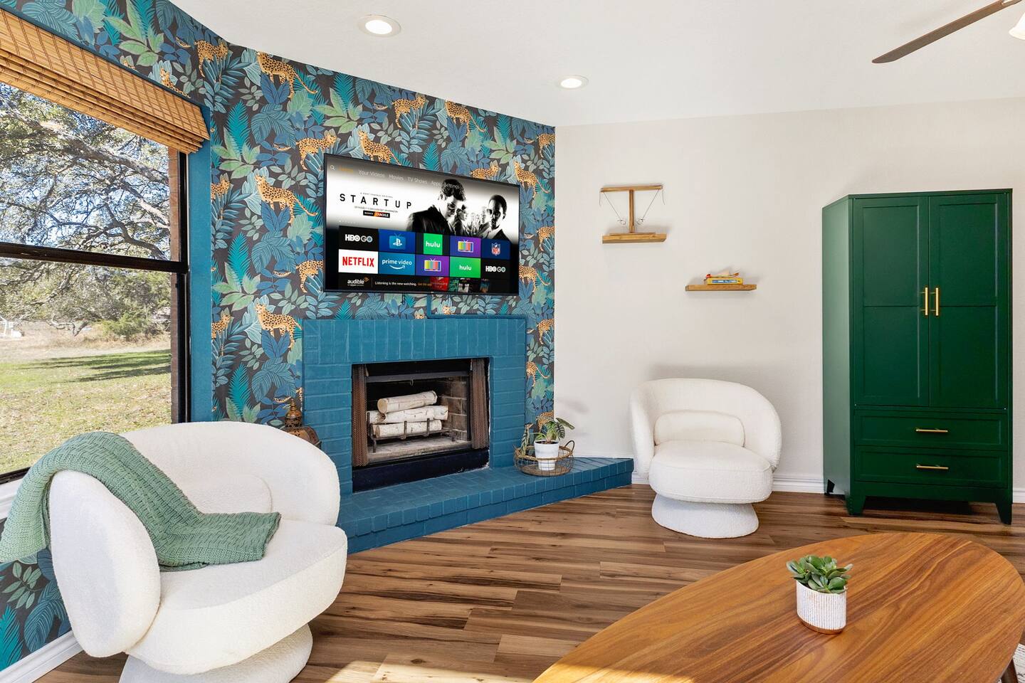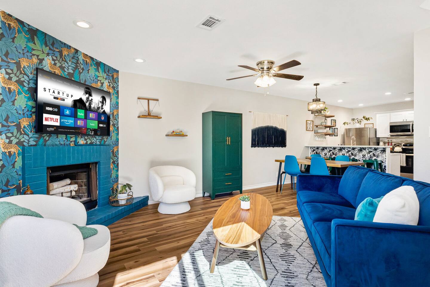 Welcome to the Wild Side Retreat, where every corner is designed for fun and comfort! The vibrant, open-concept living area invites you to unwind on the sofa, get cozy by the vibrant indoor fireplace, or spin some tunes on the record player. The striking cheetah-print accent wall sets a lively tone for your stay. Kitchen & Dining The fully equipped kitchen has everything you need to prepare delicious meals, including: -Full set of appliances -Cooking basics -Keurig coffee maker with a starter supply of K-cups Sleeping Arrangements (Sleeps 5 adults and 1 infant) Bedroom 1: King Bed with a private balcony. Bedroom 2: One Twin Bed & one Queen Bed in a fun, flamingo-themed room. Additional: A rollaway crib is available in the king room. Bedroom Comforts -Ceiling fans, USB plugs, noise machines, reading lights, and blackout blinds/curtains in all bedrooms. Indoor Living & Entertainment -Game Garage: Challenge your crew to skeeball, pop-a-shot basketball, darts, or practice on the putting mat. -Board Games: A collection of games for all ages. -Work & Entertainment: A dedicated workspace, free UltraFast WiFi, and 3 Smart TVs. For Little Ones -Highchair and crib (with sheets) are available for your convenience. Outdoor Living -Private patio with comfortable seating and charming string lights. -Charcoal grill for cookouts. -Backyard games including giant Jenga, cornhole, and bocce ball.