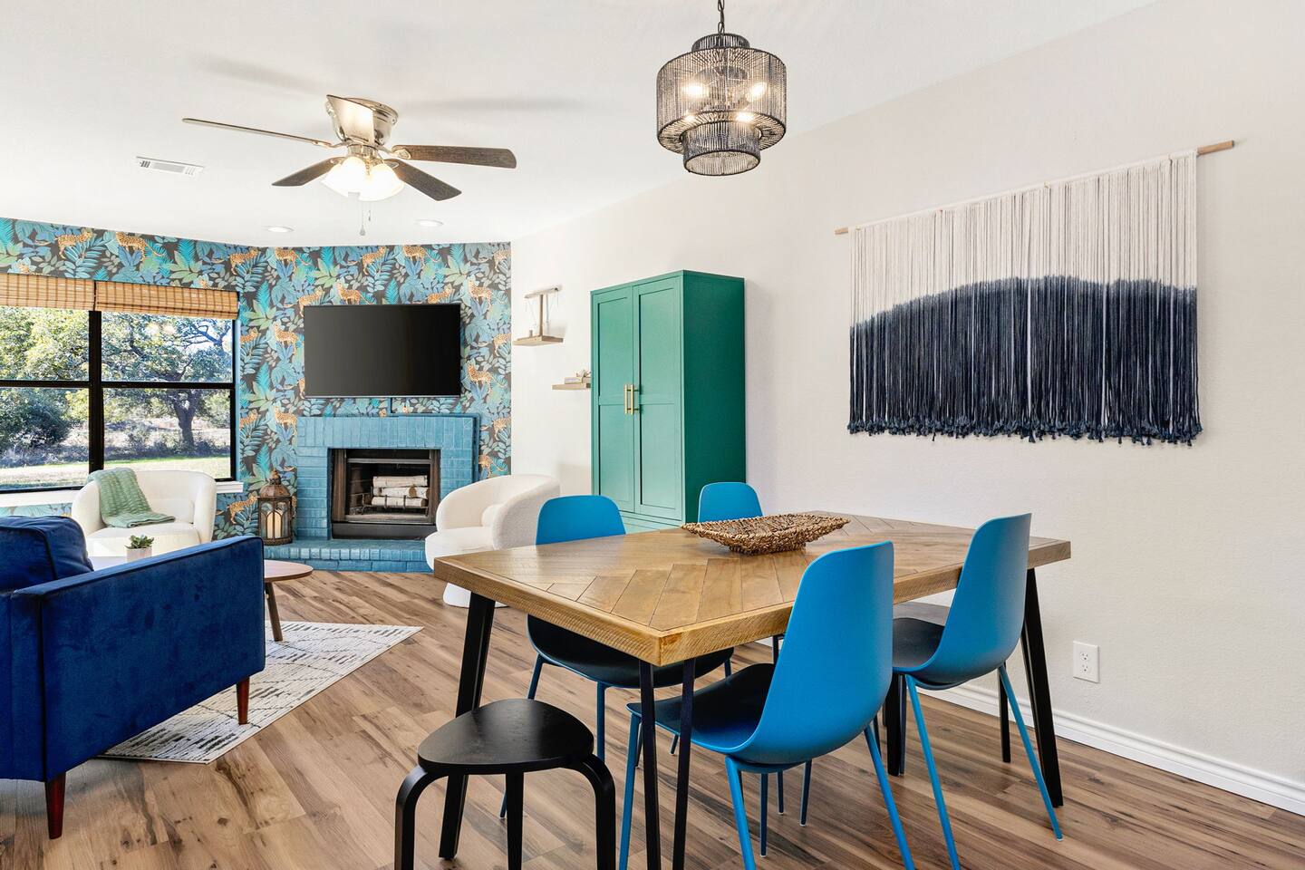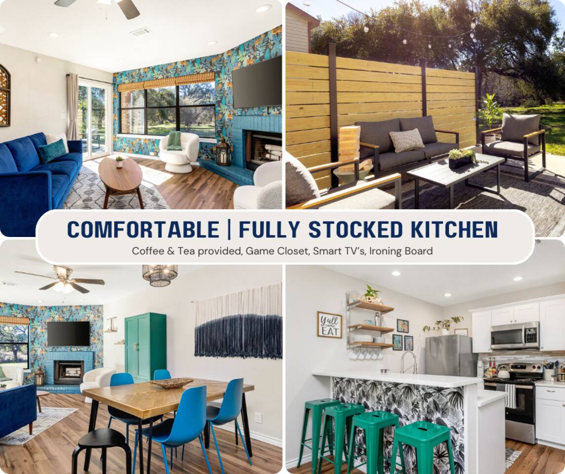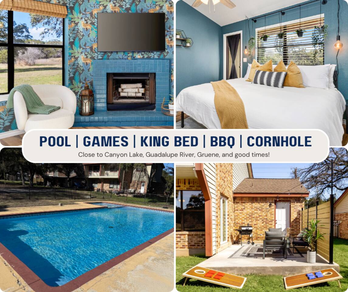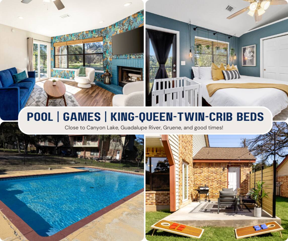 Just minutes from Canyon Lake, Wild Side Retreat is the perfect getaway for families and groups. Enjoy a fully equipped game garage with darts, pop-a-shot basketball, skeeball, and a putting mat, plus backyard fun with giant Jenga and cornhole. Guests also have access to a community pool, along with cozy indoor spaces, board games, and easy access to hiking, shopping, live music, and great local eats.